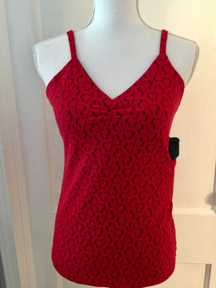 Custom VNeck tank top with pinch front detail. Womens SMALL. Stretch, red, heart print, slimming. Right Hand Cross Draw Holster (not for quick draw). Holds small-medium handgun. Bust 32-36", Waist 28'30", Hips 34-36" (Handgun not included) Hand wash cold. Hang dry. Made in USA.