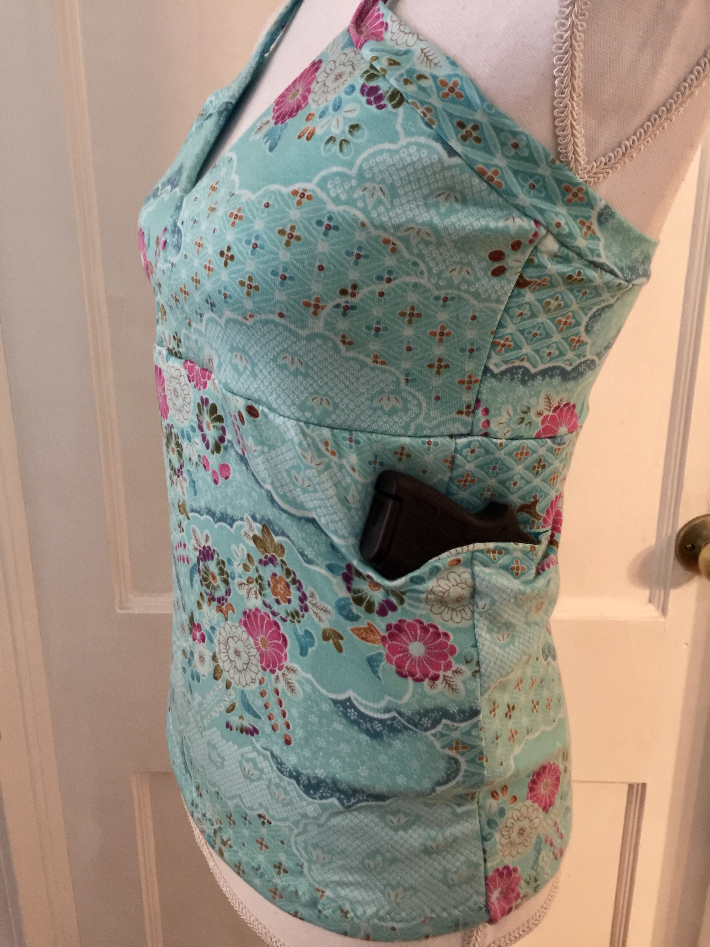 Custom VNeck halter top with tie closure. Womens SMALL. Stretch, teal / turquoise floral print, slimming. Right Hand Cross Draw Holster (not for quick draw). Holds small-medium handgun. Bust 32-36", Waist 28'30", Hips 34-36" (Handgun not included) Hand wash cold. Hang dry. Made in USA.