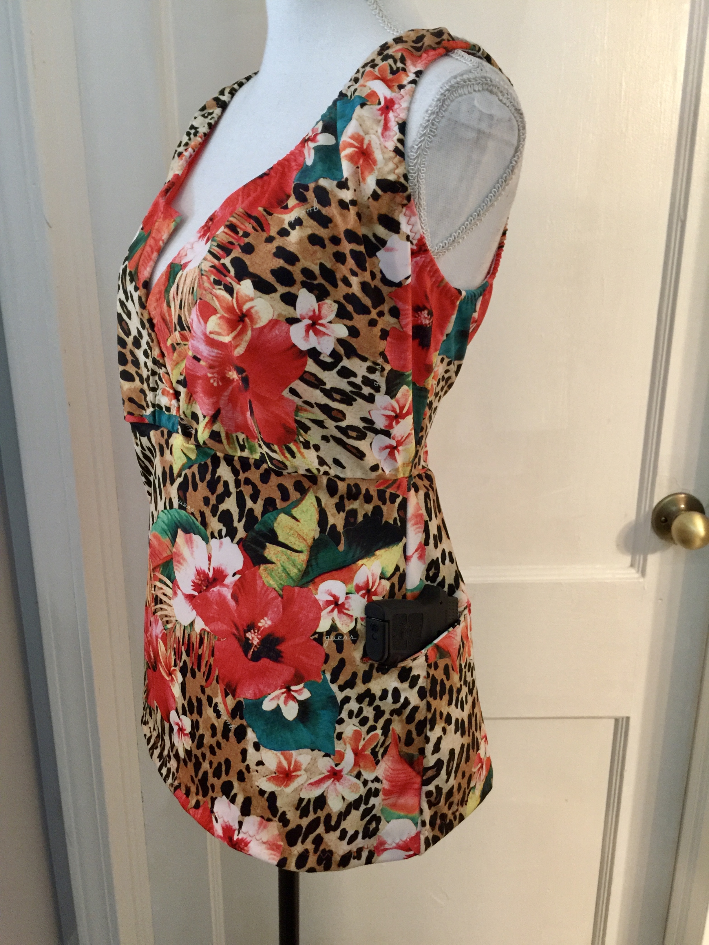 Custom holster top. Womens LARGE. Stretch, tropical /jungle / floral print, slimming. Right Hand Cross Draw Holster (not for quick draw). Holds small-medium handgun. LARGE measurements: Bust 40-42", Waist 35-37", Hips 38-40" (Handgun not included) Hand wash cold. Hang dry. Made in USA.