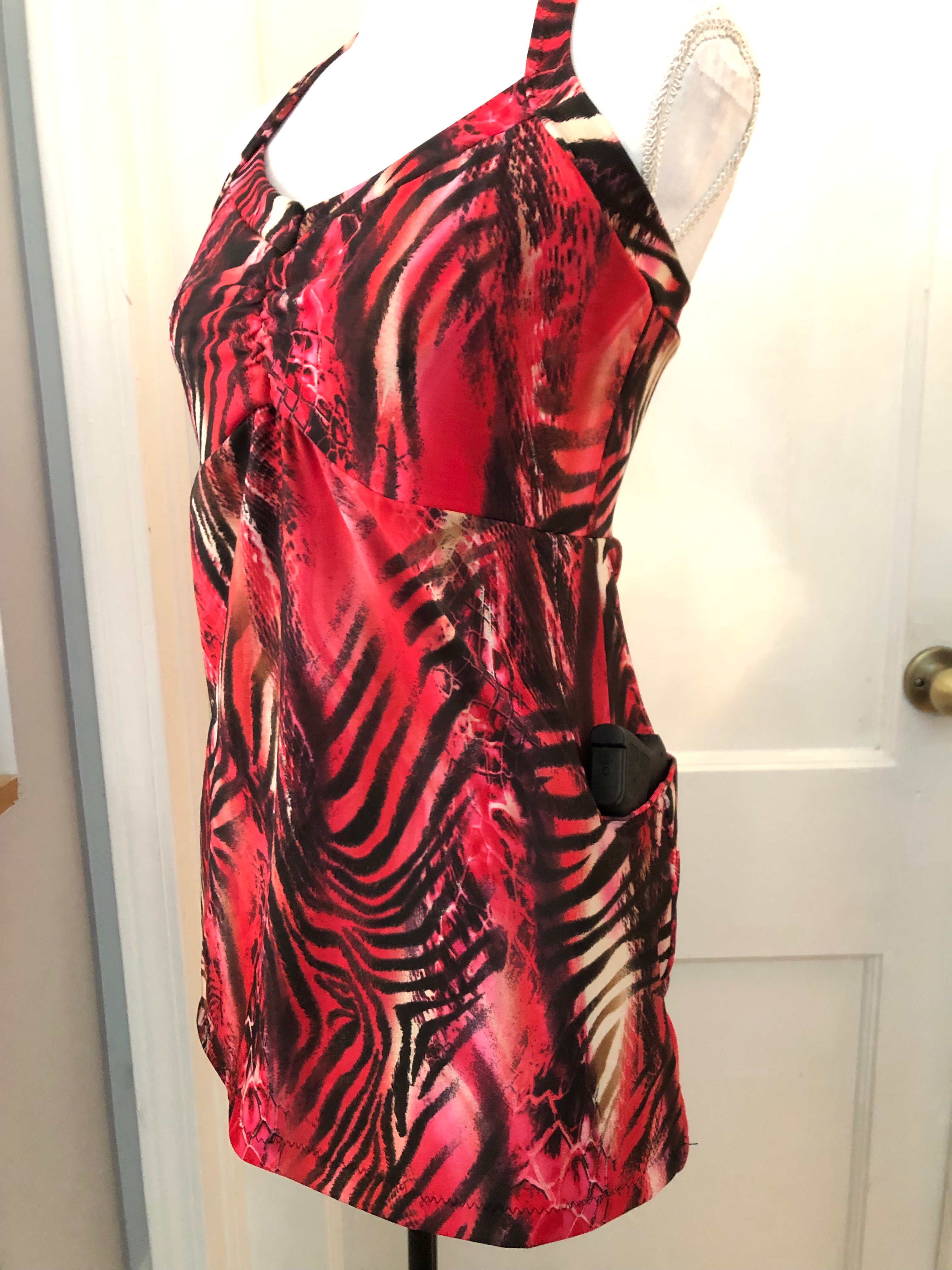 Custom halter with tie closure. Womens MEDIUM, Stretch, Slimming, Lined, Right Hand Cross Draw Holster (not for quick draw). Holds small-medium handgun. Bust 36-38", Waist 32-34", Hips 36-38" (Handgun not included) Handwash cold, hang dry Made in USA