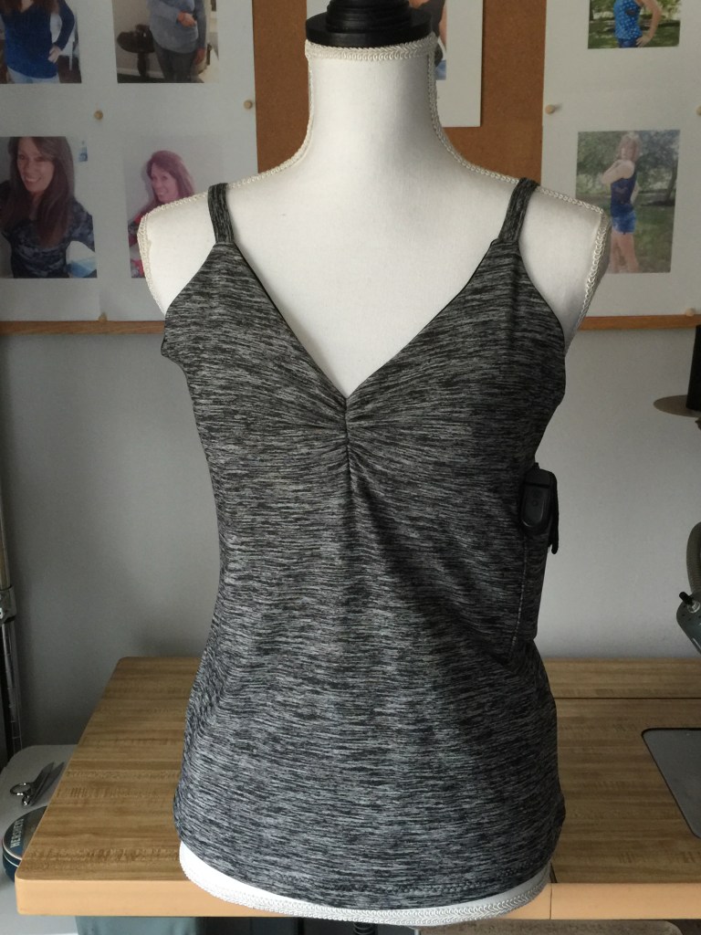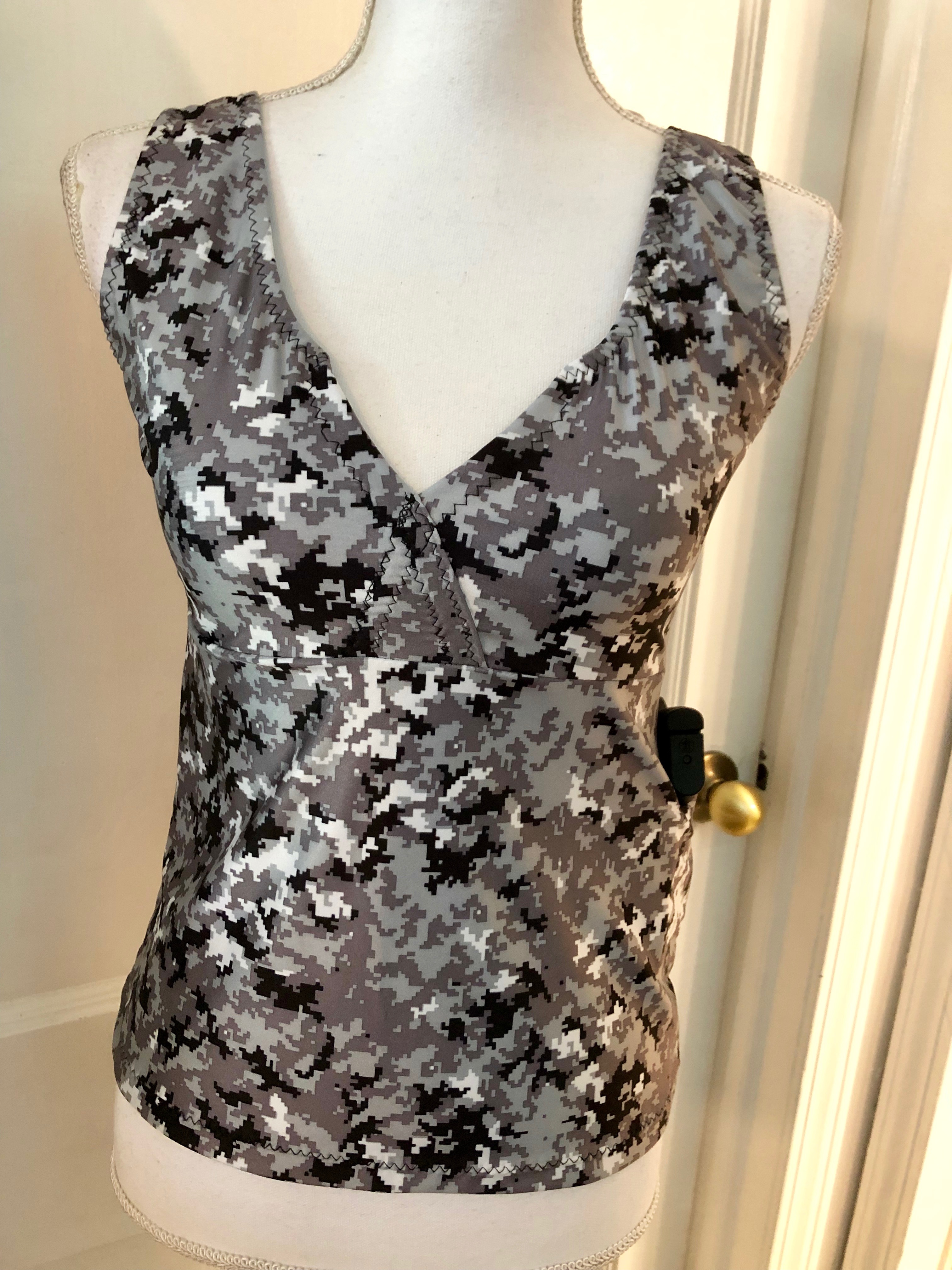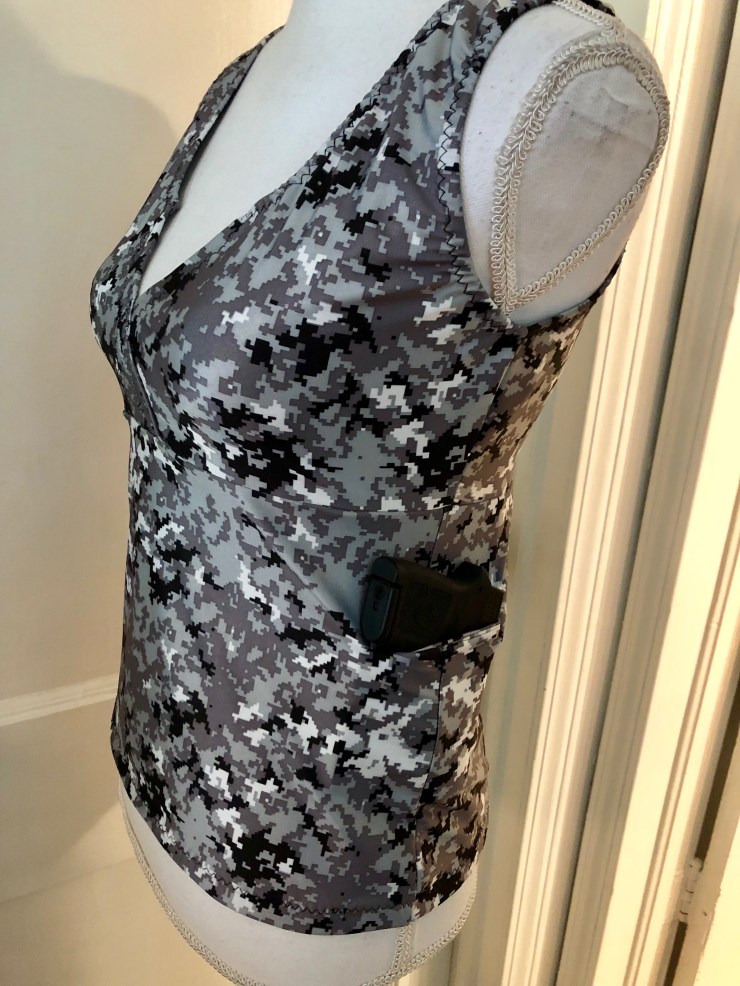 Holster Carry Top, sleeveless tank, Womens SMALL, V-Neck, Gray Camo print Custom VNeck tank. Womens SMALL or MEDIUM. Stretch, gray / black camo print, slimming. Right Hand Cross Draw Holster (not for quick draw). Holds small-medium handgun. SMALL measurements: Bust 32-36", Waist 28'30", Hips 34-36" (Handgun not included) Hand wash cold. Hang dry. Made in USA.