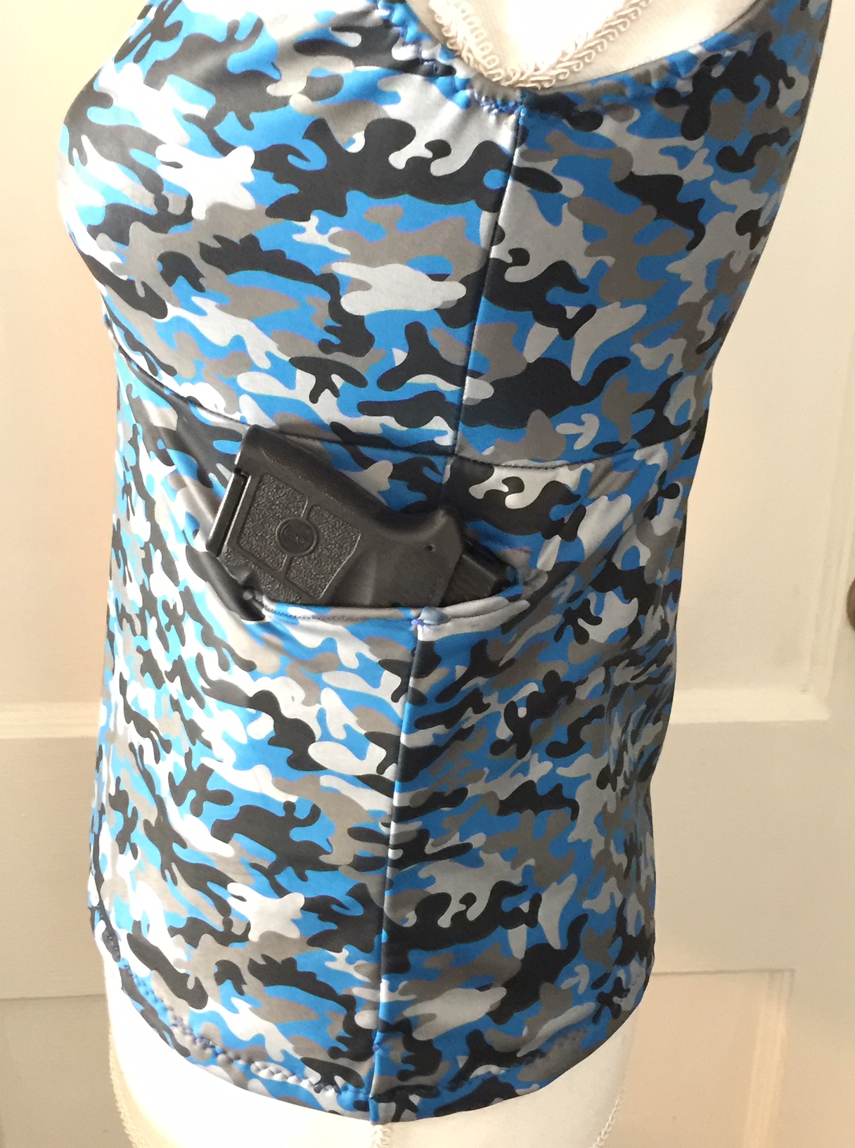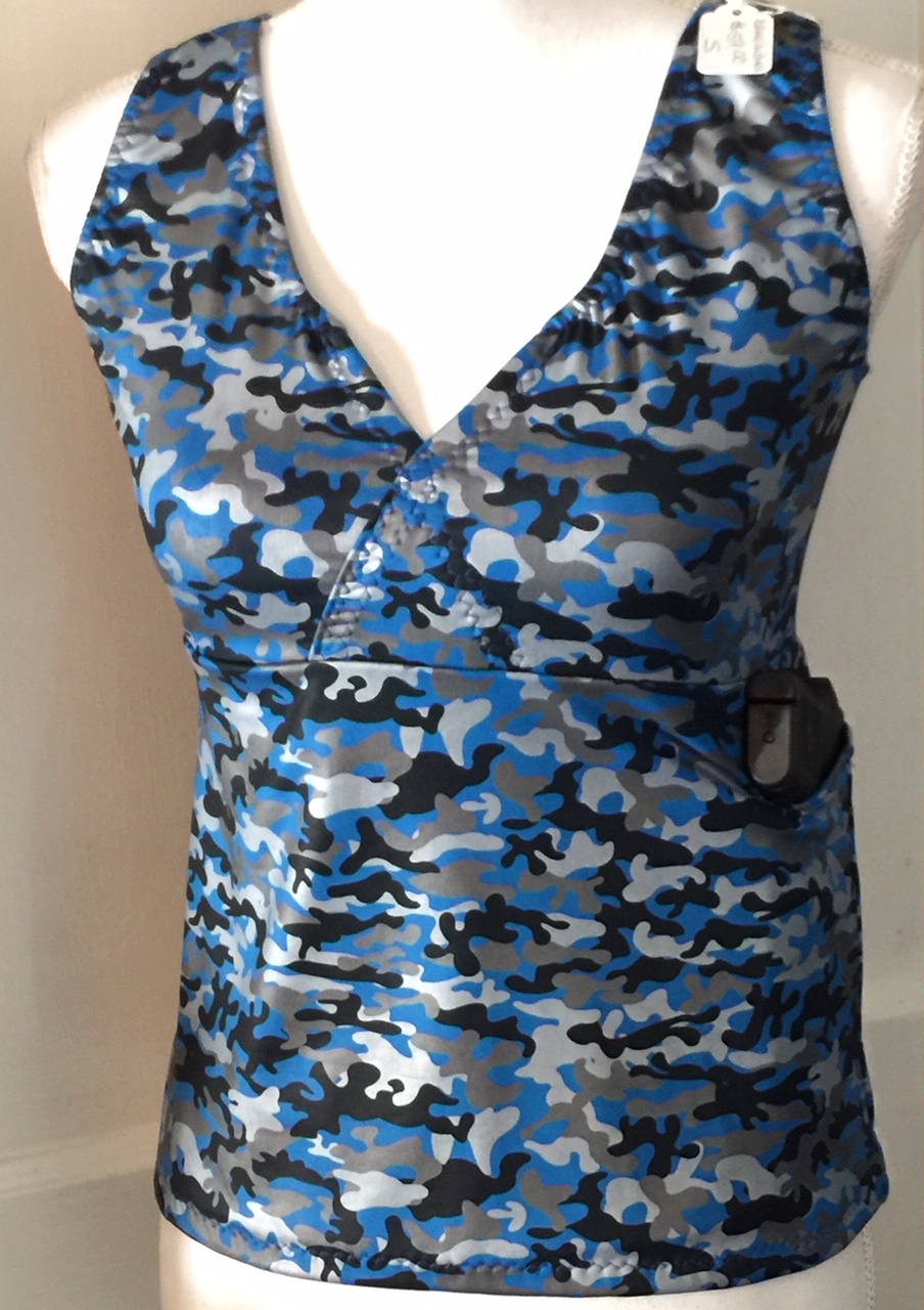 Holster Carry Top, sleeveless tank, Womens SMALL, V-Neck, Blue Camo print Custom VNeck tank. Womens SMALL. Stretch, blue camo print, slimming. Right Hand Cross Draw Holster (not for quick draw). Holds small-medium handgun. SMALL measurements: Bust 32-36", Waist 28'30", Hips 34-36" (Handgun not included) Hand wash cold. Hang dry. Made in USA.